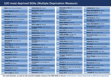As shown in the table, the top 20 most deprived Super Output Areas are dominated by North Belfast, West Belfast and Derry.