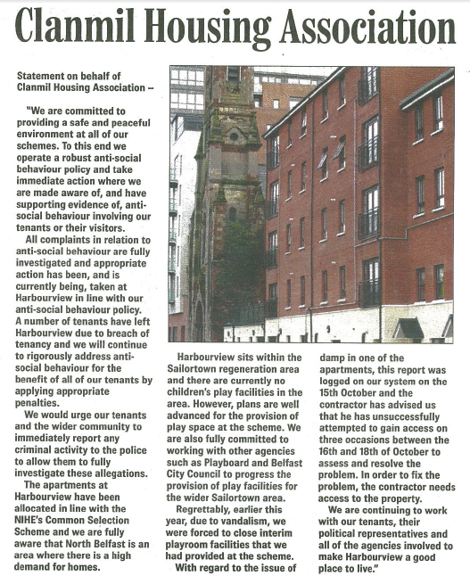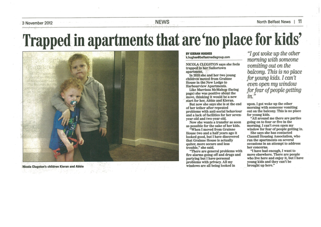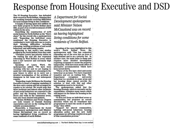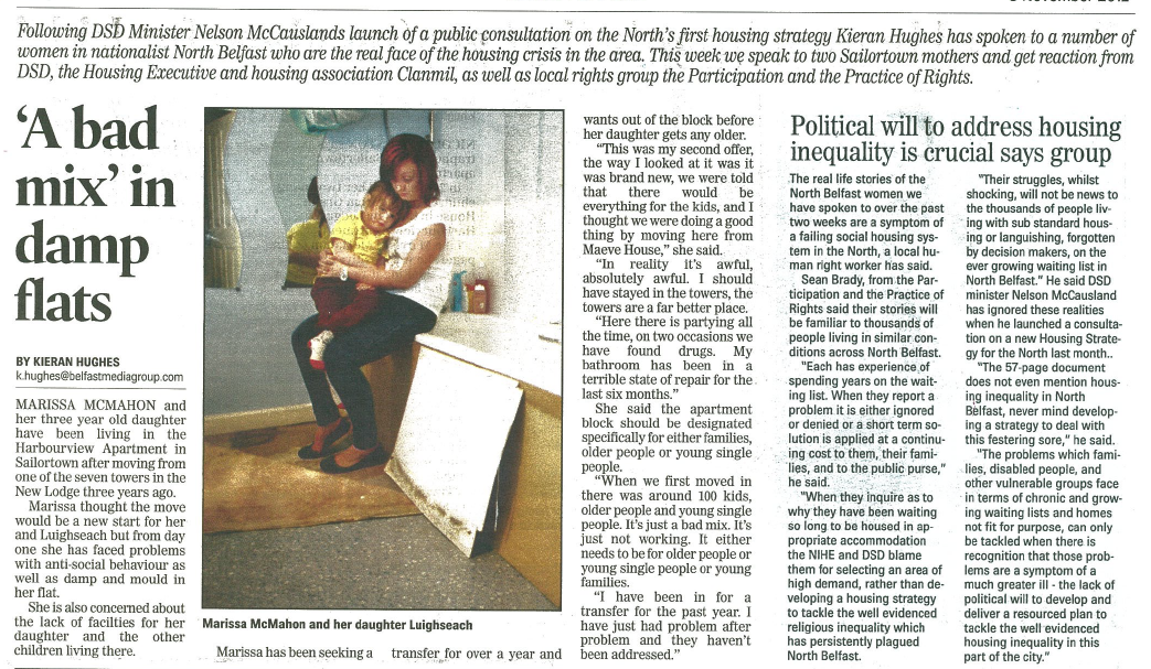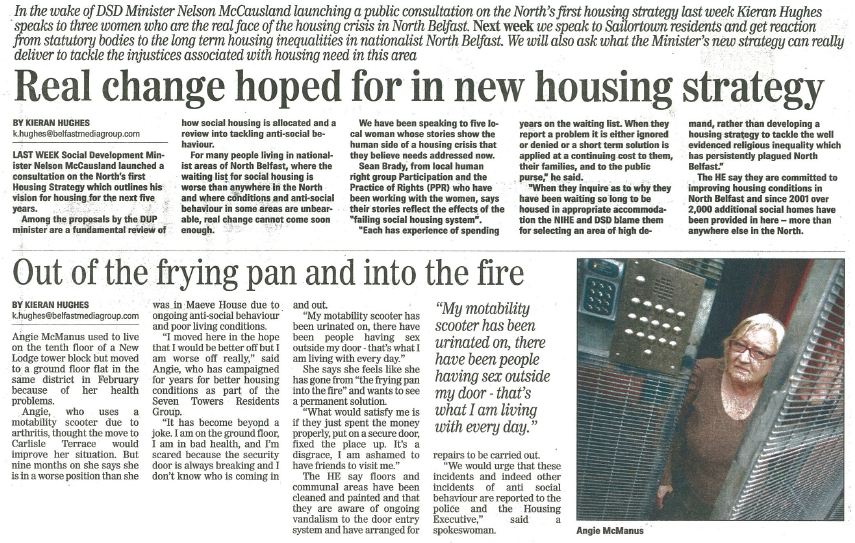 Having received either no response or having been told again that their housing conditions are a result of personal choice the North Belfast women have used the press to help highlight their ongoing struggle for equality and decent housing conditions.
