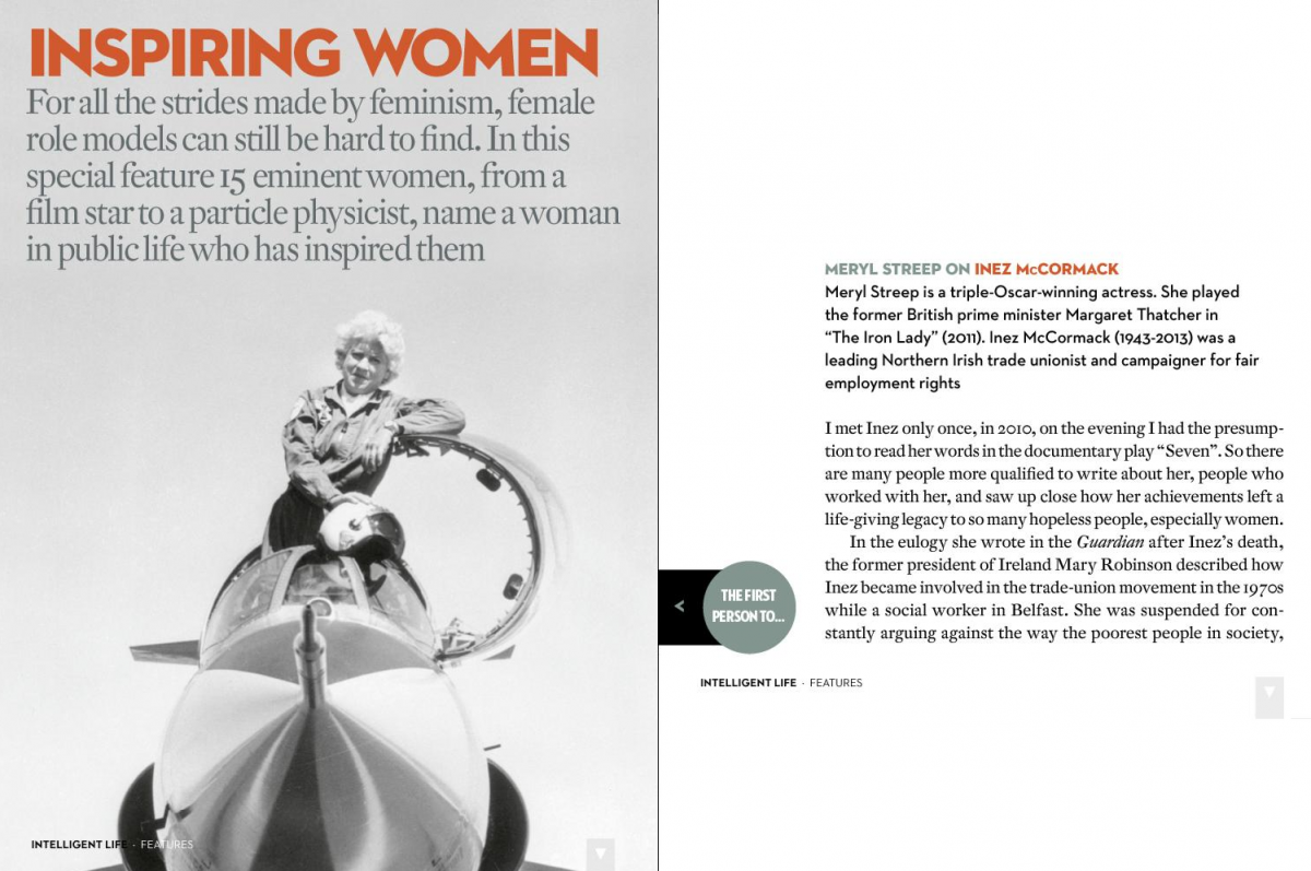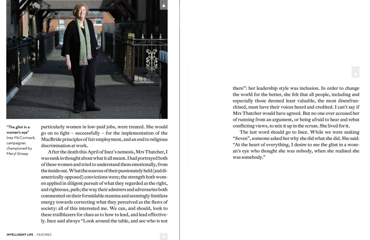 The following article was featured in this month’s edition of The Economist’s Intelligent Life and asks a number of women – some famous, all eminent – to talk about a woman who has inspired them – Meryl Streep talks about Inez McCormack.