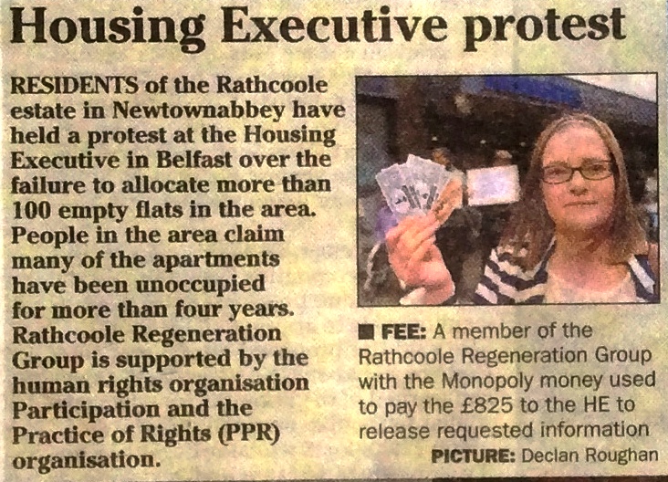 Rathcoole Regeneration Group, supported by PPR, have welcomed the decision by the Northern Ireland Housing Executive to rent out 30 publicly owned but empty flats in their area to address housing need, but are insistent that much more needs to be done to fulfil housing rights obligations impacting their community.